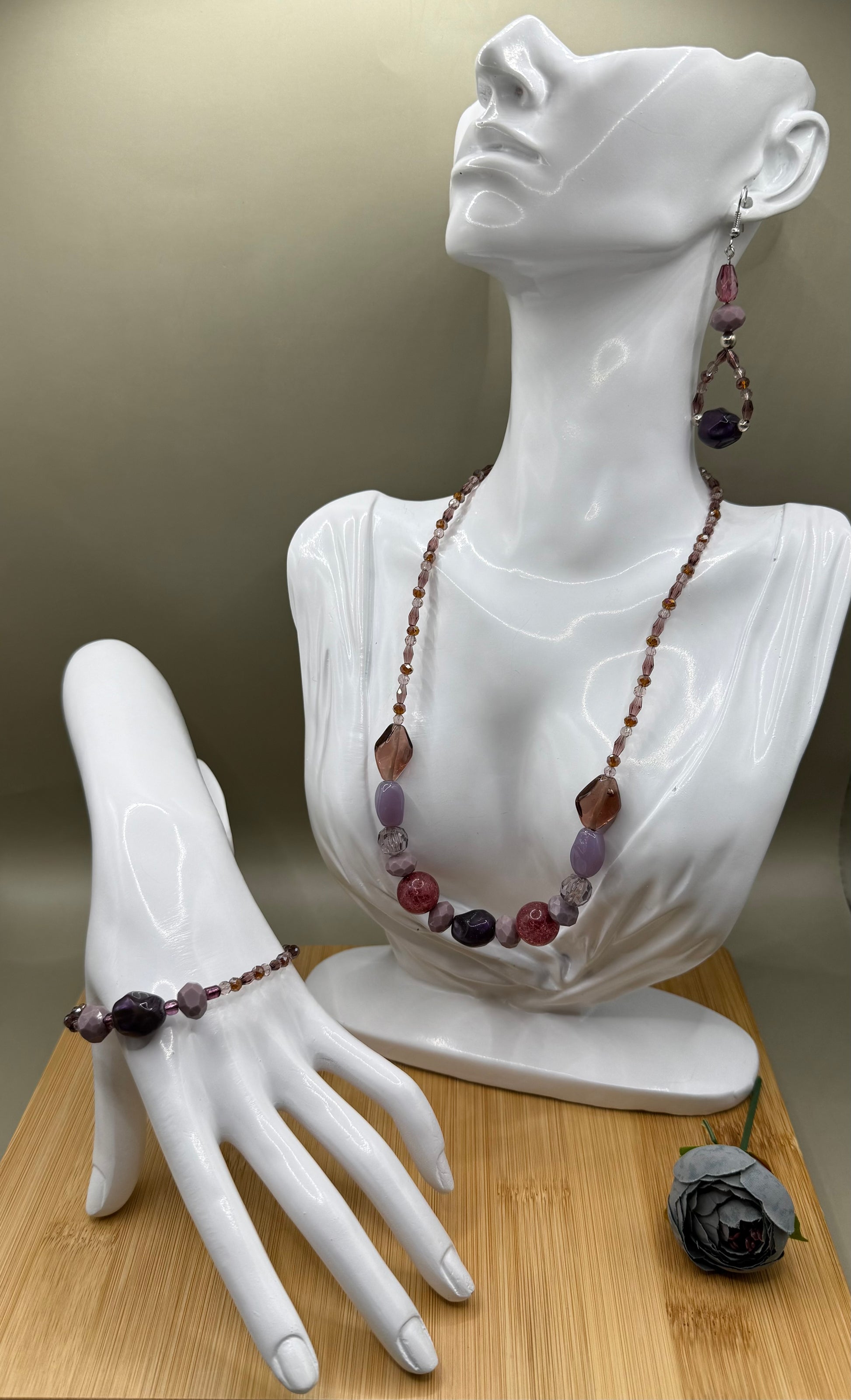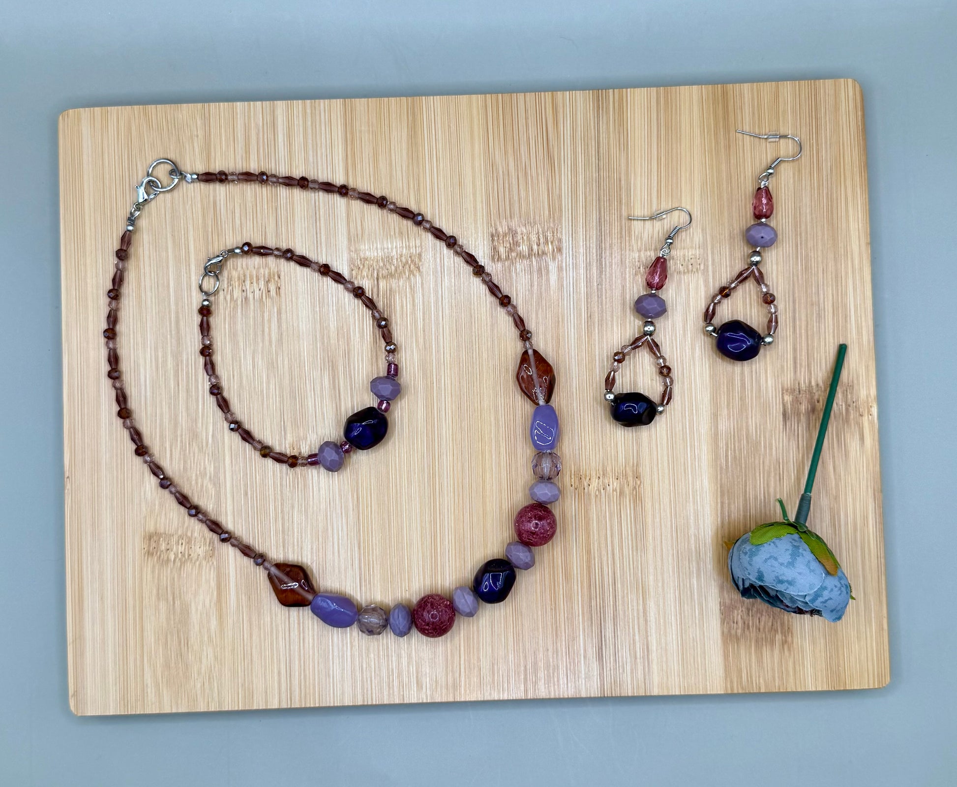Wire; Various hues of purple glass, faceted and plastic beads.