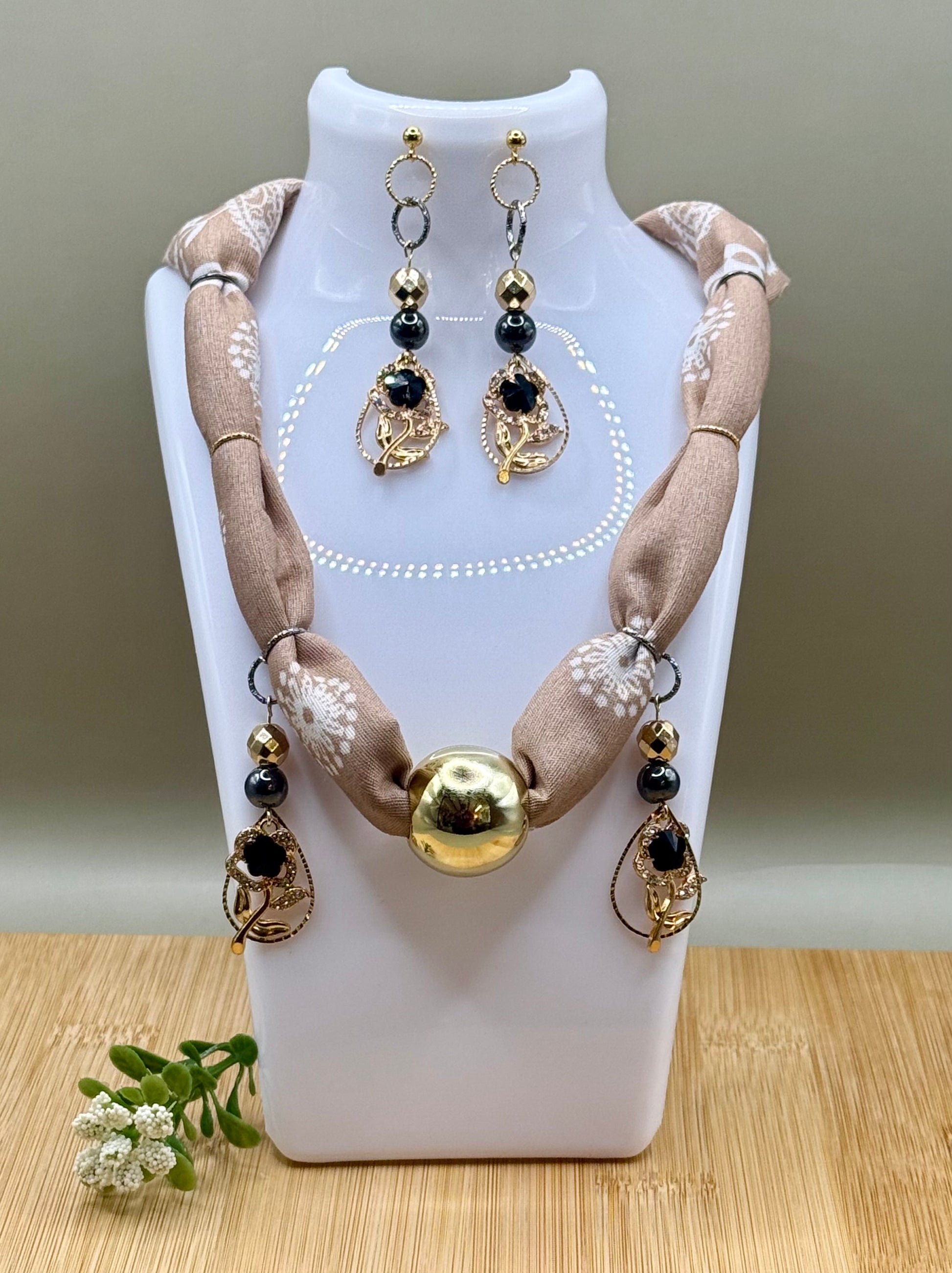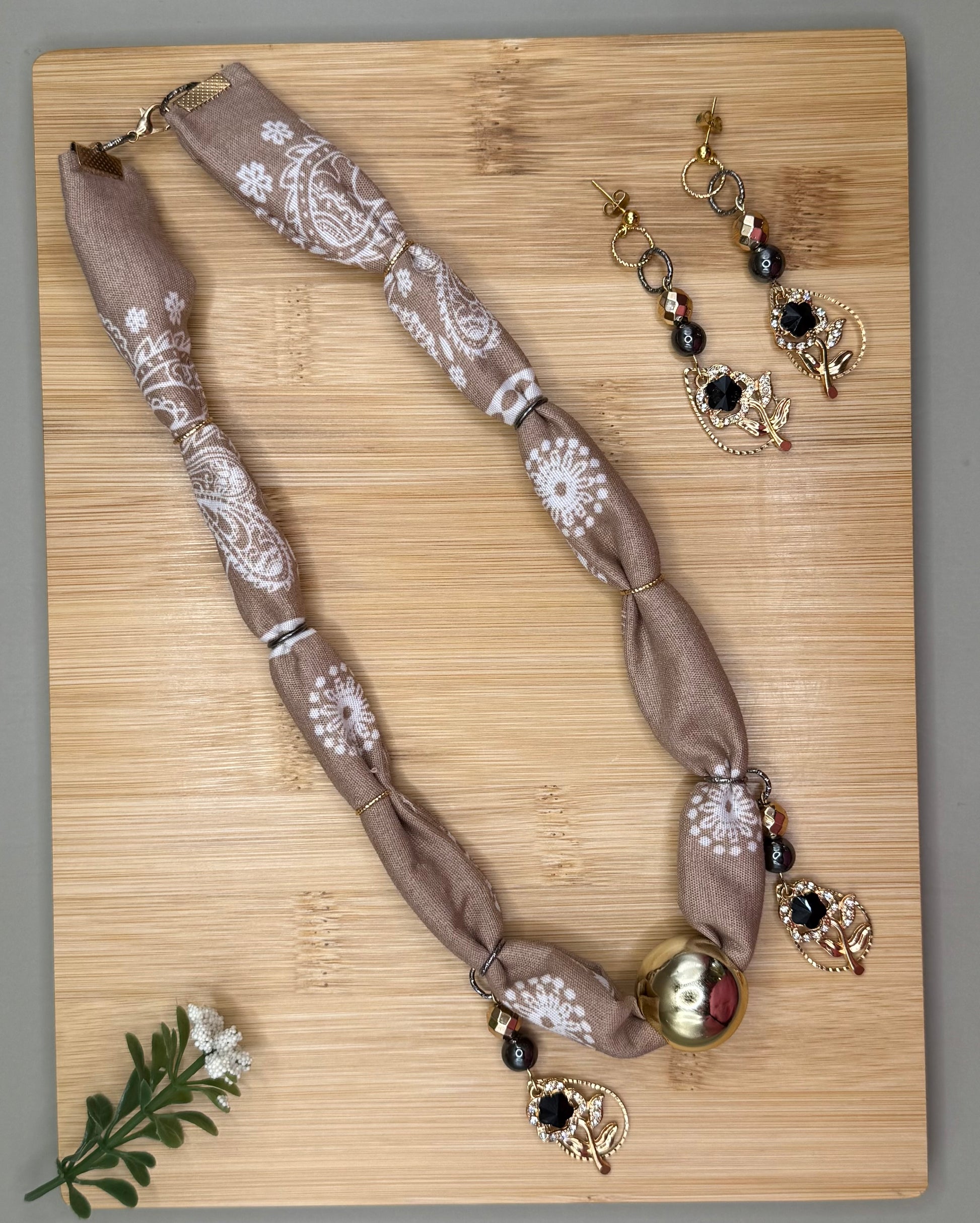 Khaki handkerchief with gold accents and flower pendants. Paired with matching earrings