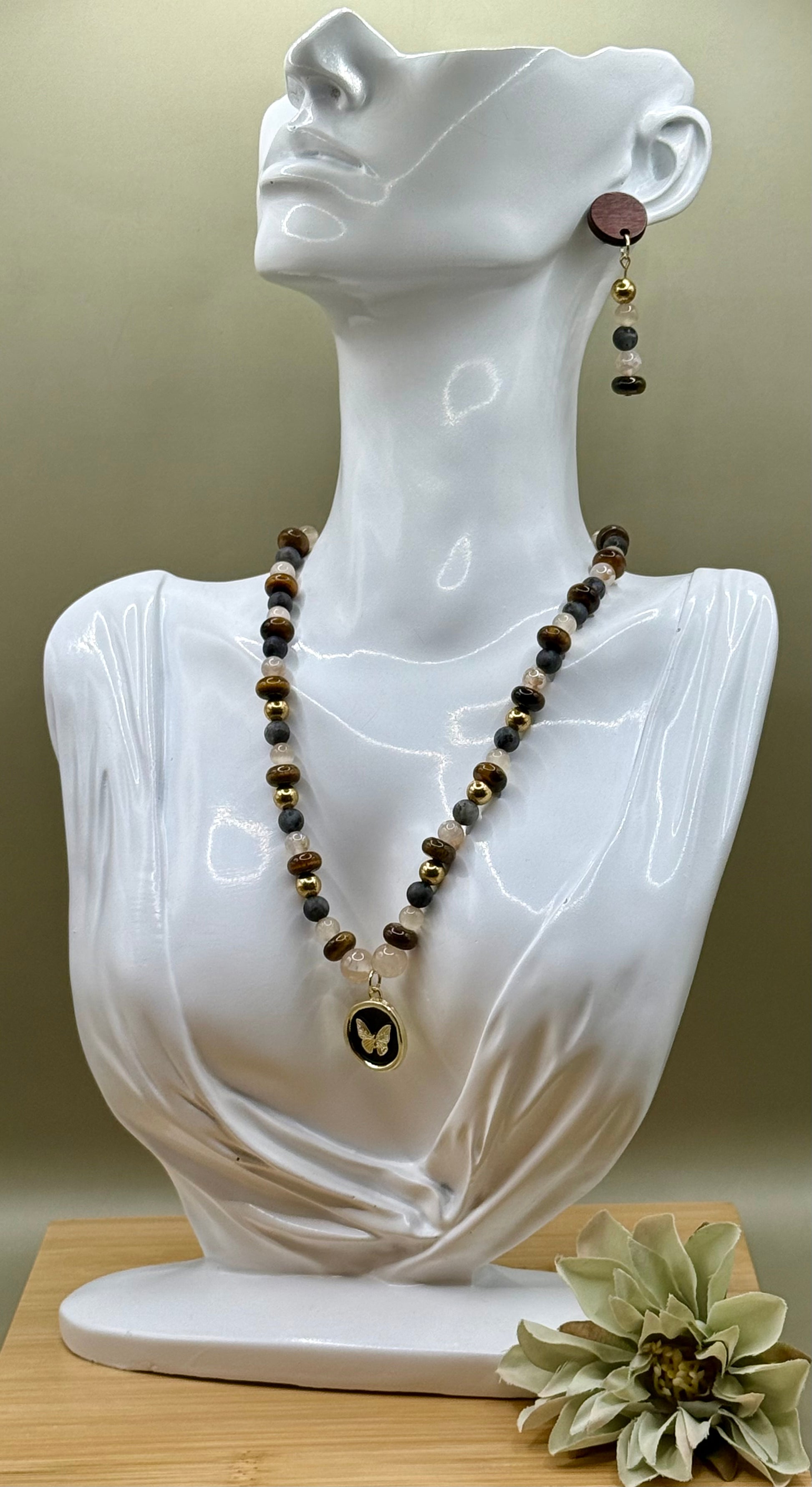 Materials: Elastic; Moonstone, tiger eye and gray with Stainless steel butterfly pendant.